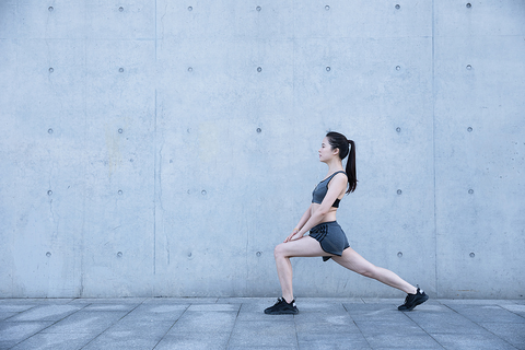① Single-leg leg press: Take a step forward with your left leg in a half-bent position, then place your hands on your knees and press down for eight beats. Then switch to your right leg and repeat the same action.
