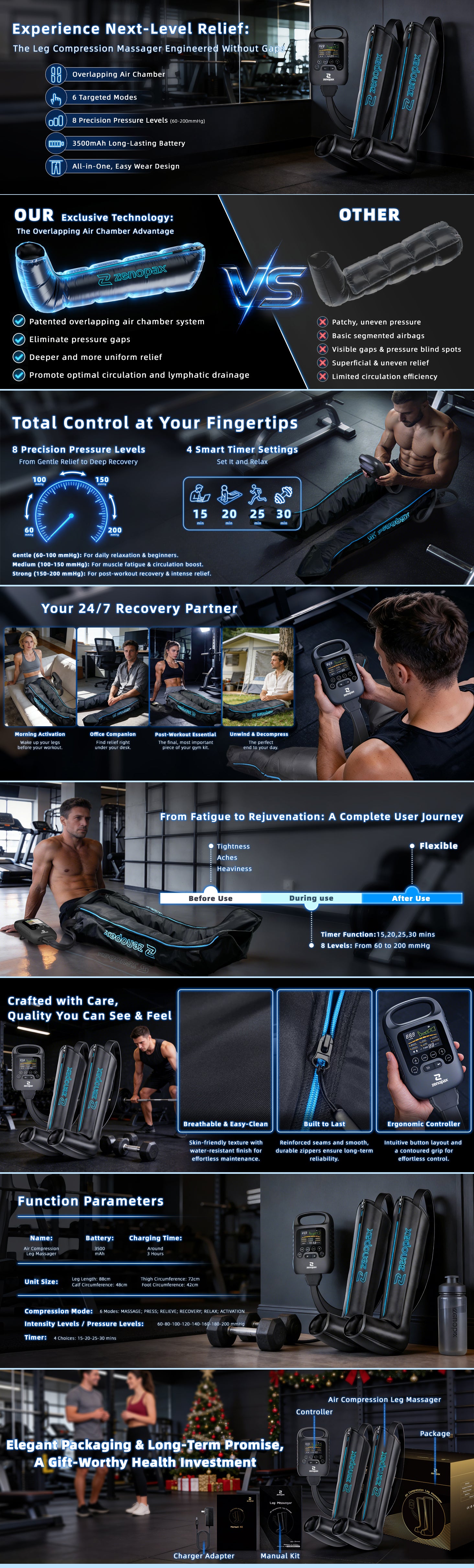 Leg Compression Massager with Overlapping Airbags, Full Leg Air Compression Leg Massager for Circulation and Pain, with 8-Level Pressure (60-200mmHg), 6 Modes, Timer and Built-in 3500mAh Battery